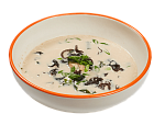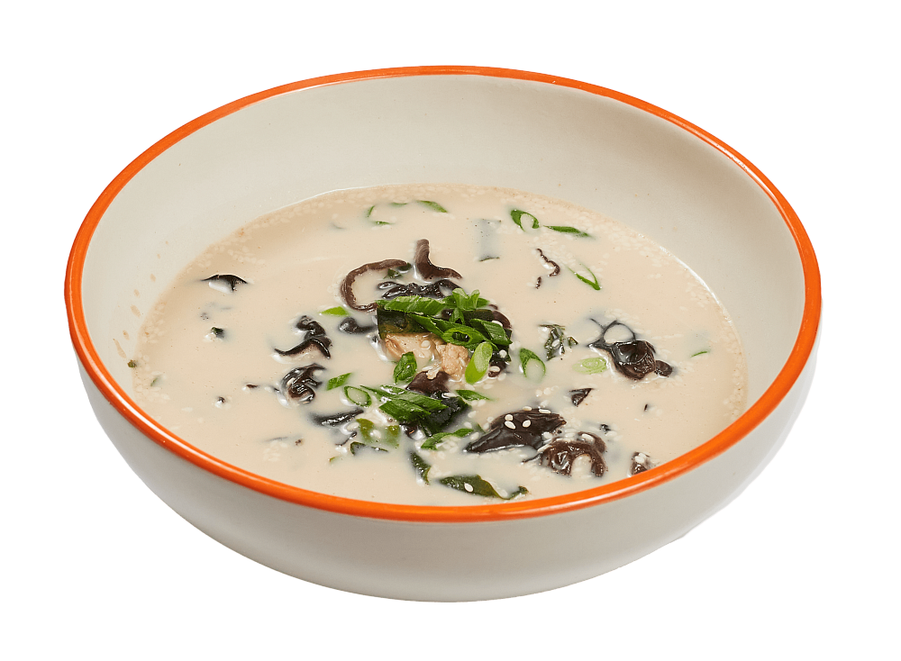 Бульон на основе мисо, сливки, куриная грудка, водоросли вакамэ, грибы муэр, кунжут, лук порей